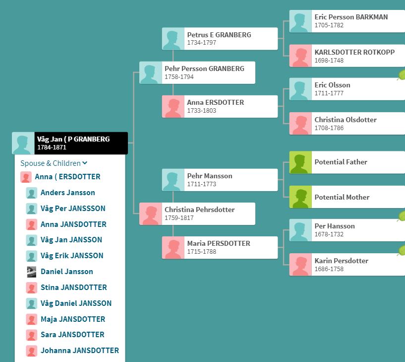 - Våg Jan's father's father Petrus Ersson Granberg and father's mother Anna Ersdotter Petrus was a soldier and he and Anna had a difficult life. By the time of malnutrition in Sweden 1772-73, when 5% of the population died, the family was severely affected. Five of the seven children died of rubella (dysentery). Petrus and Anna moved to Finland, which was then a part of Sweden. Their two youngest children Johan (b.1774) och Catharina (b.1780) grew up there and became Russian nationals when Sweden lost Finland to Russia 1809 (se page Finland in our history ).